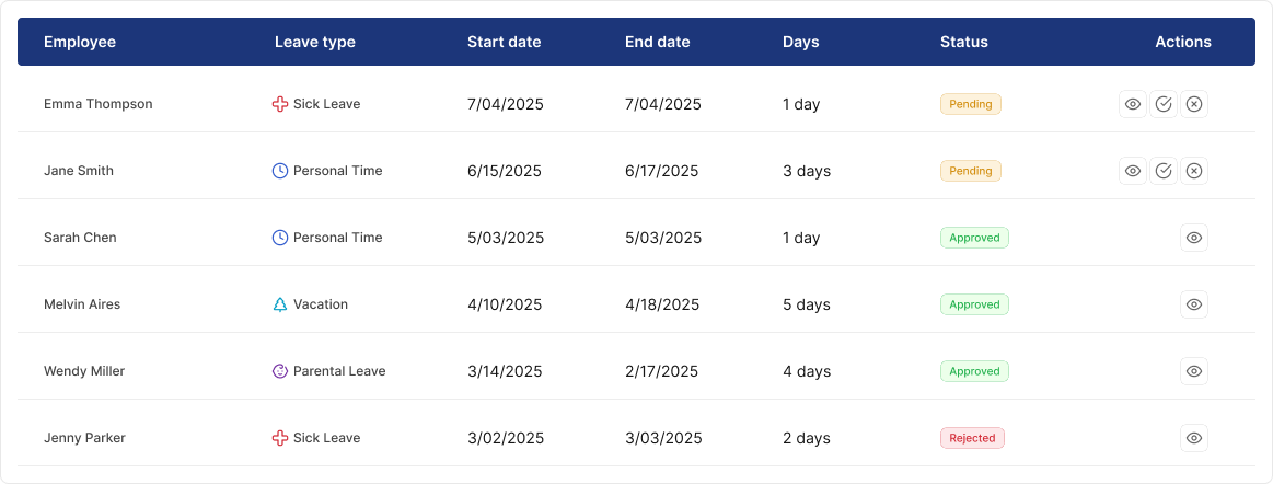 Employees and managers can easily view available leave days, with real-time updates whenever time off is approved. This ensures complete transparency and helps prevent scheduling conflicts. The balance tracking includes the following: